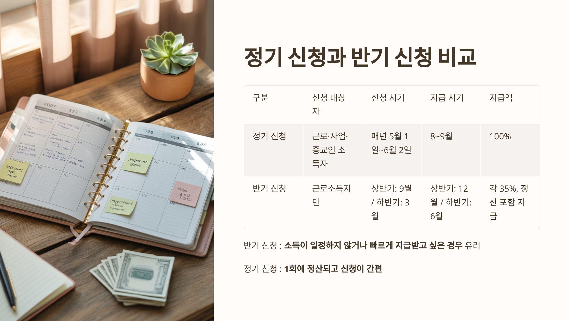 - 반기 신청은 소득이 일정하지 않거나 빠르게 지급받고 싶은 경우 유리