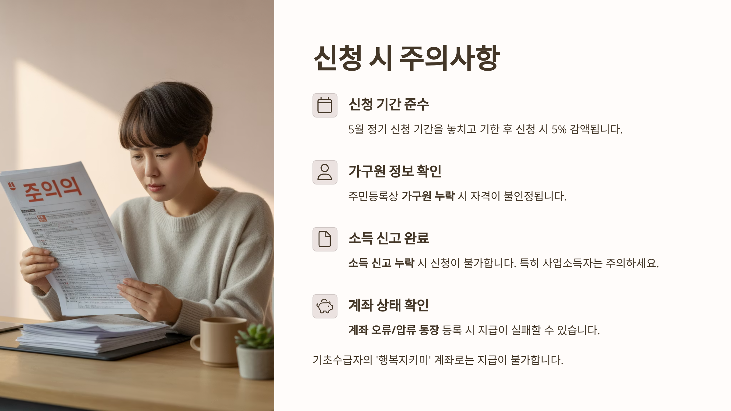 - 소득 신고 누락 시 신청 불가 (사업소득자 주의)