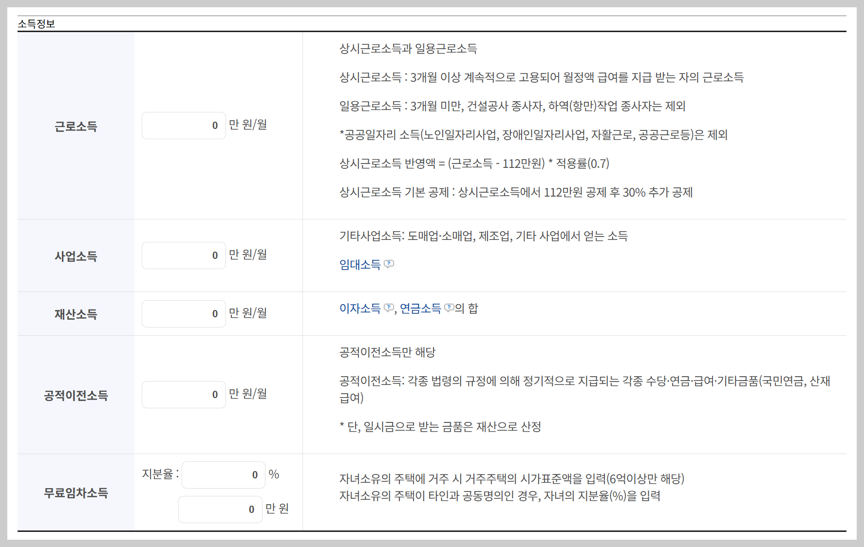 | 근로소득 | 세전 월소득 입력, 일용직 제외 |