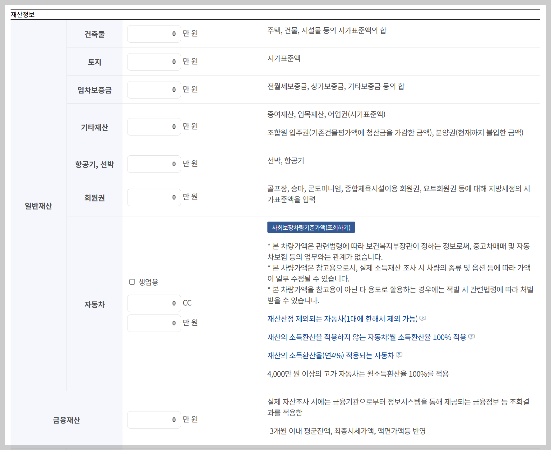 | 자동차 | 보험개발원 차량가액 기준 입력 |