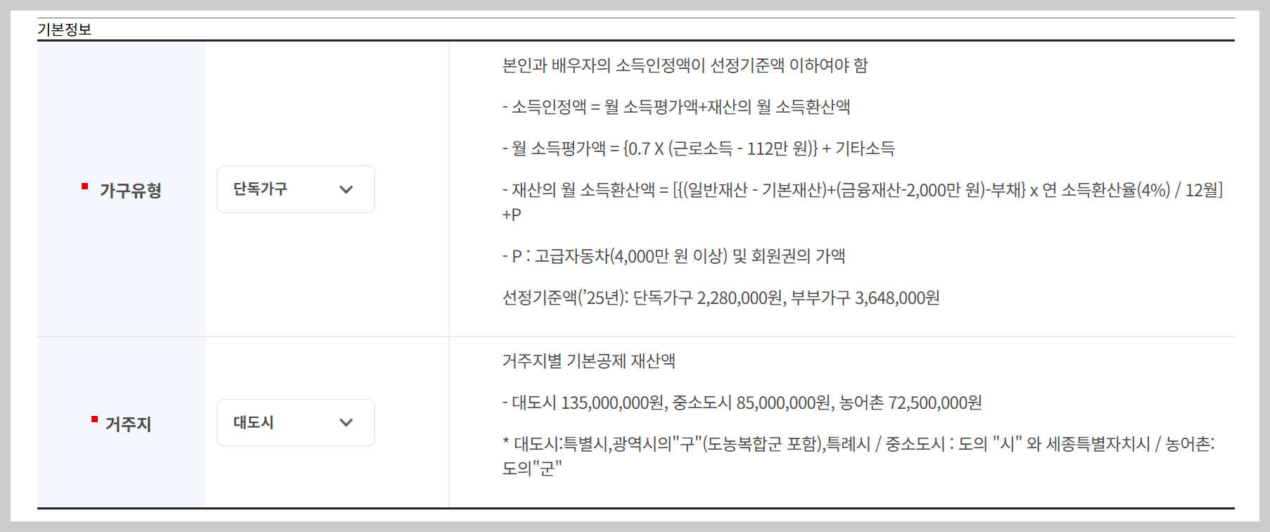 | 소득인정액 기준 | 단독가구: 221만 원 이하, 부부가구: 353만 6천 원 이하 (2025년 기준) |