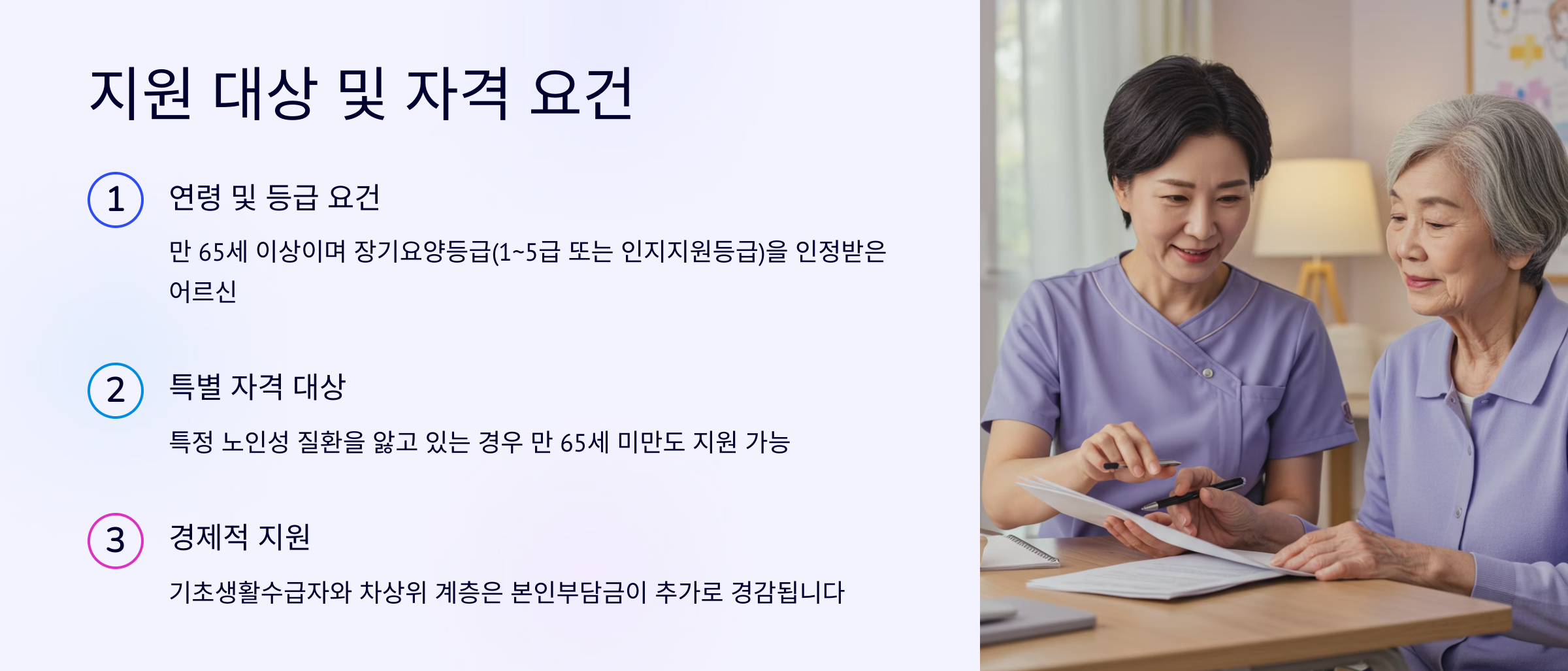 - 연령 기준: 만 65세 이상 어르신 또는 노인성 질환을 가진 65세 미만 장기요양보험 수급자