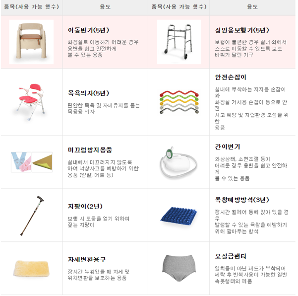 - 이동변기, 목욕의자, 성인용 보행기, 안전 손잡이, 미끄럼 방지 용품, 간이변기, 지팡이, 욕창 예방 방석, 자세 변환 용구, 요실금 팬티