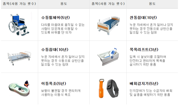 - 수동 휠체어, 전동 침대, 수동 침대, 이동 욕조, 목욕 리프트, 배회 감지기