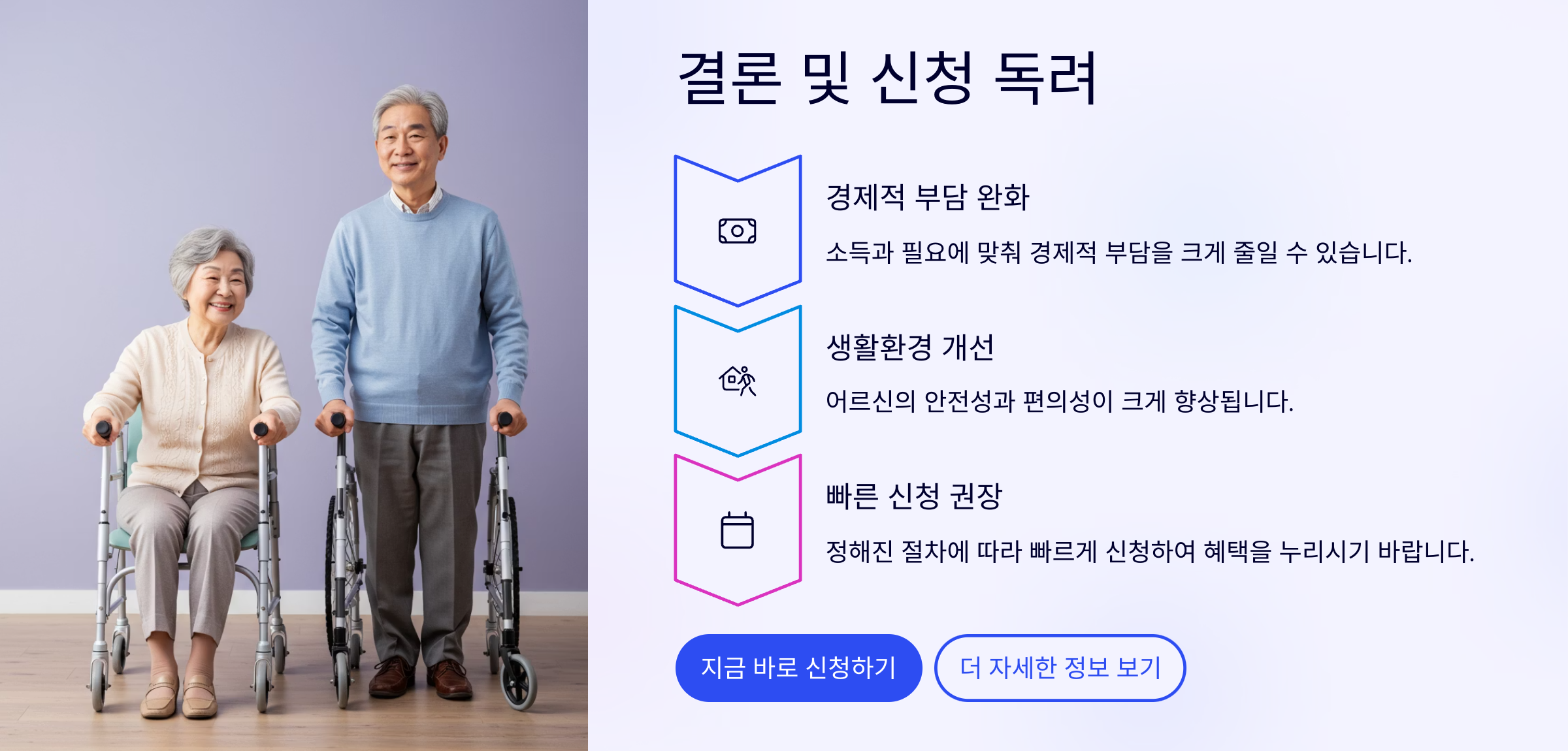 지금 바로 신청을 통해 어르신 본인 또는 가족분들의 생활환경을 한 단계 더 안전하고 편안하게 개선해 보시기 바랍니다