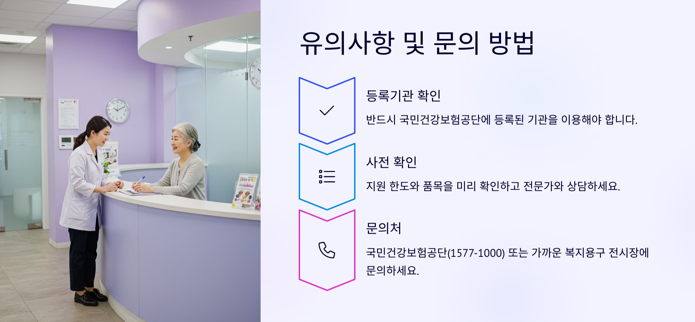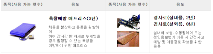- 신체 상태에 따른 제한: 수급자의 신체 상태에 따라 일부 품목의 구입 또는 대여가 제한될 수 있습니다.