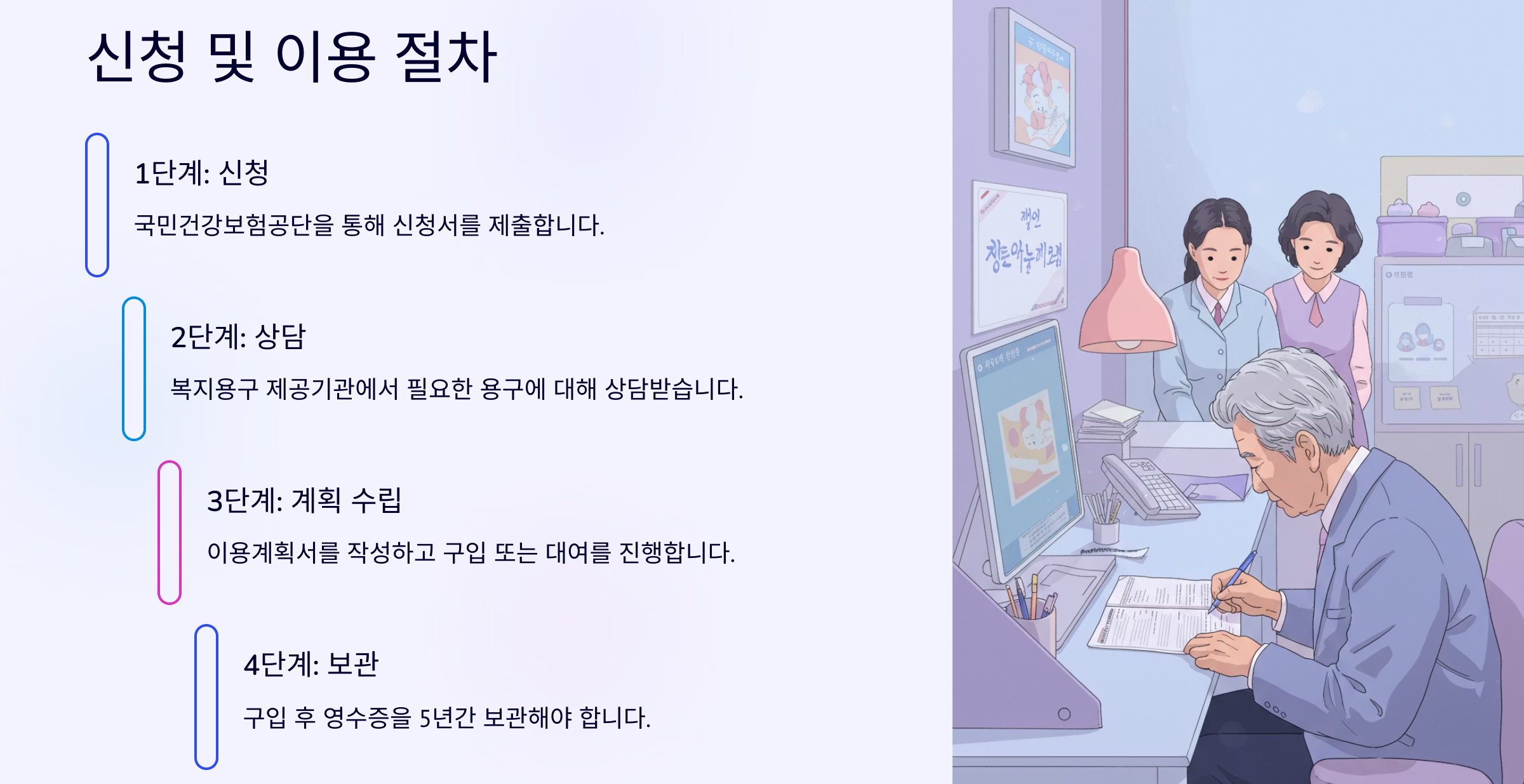 이 제도를 통해 수급자는 연간 최대 160만원 한도 내에서 복지용구를 구입하거나 대여할 수 있으며, 본인 부담률은 일반적으로 15%이나, 저소득층은 0~9%까지 경감됩니다.