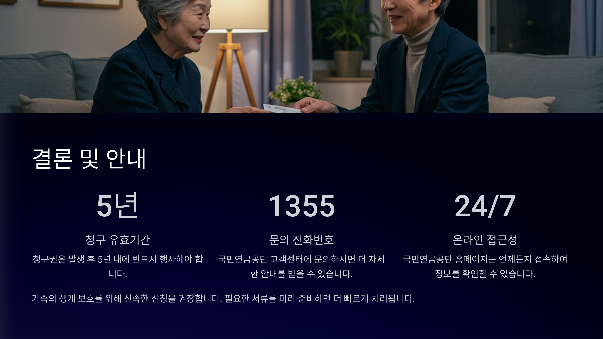 유족연금은 단순한 정부 지원금을 넘어, 남겨진 가족이 최소한의 생활 안정을 유지하고 미래를 준비할 수 있도록 돕는 든든한 제도입니다. 만일의 상황을 대비해 사전에 제도를 잘 이해하고, 수급 자격이 발생하면 적극적으로 신청 절차를 진행하시길 권해드립니다.