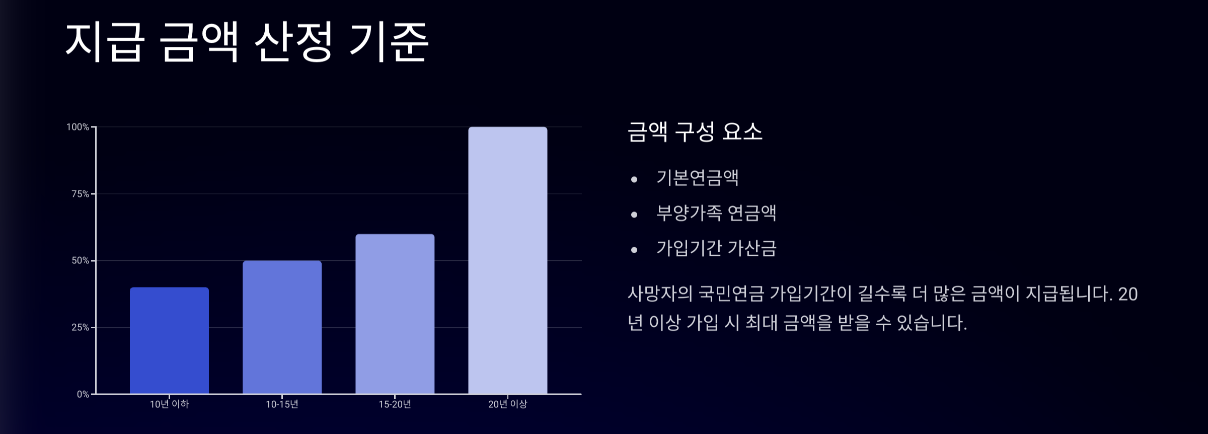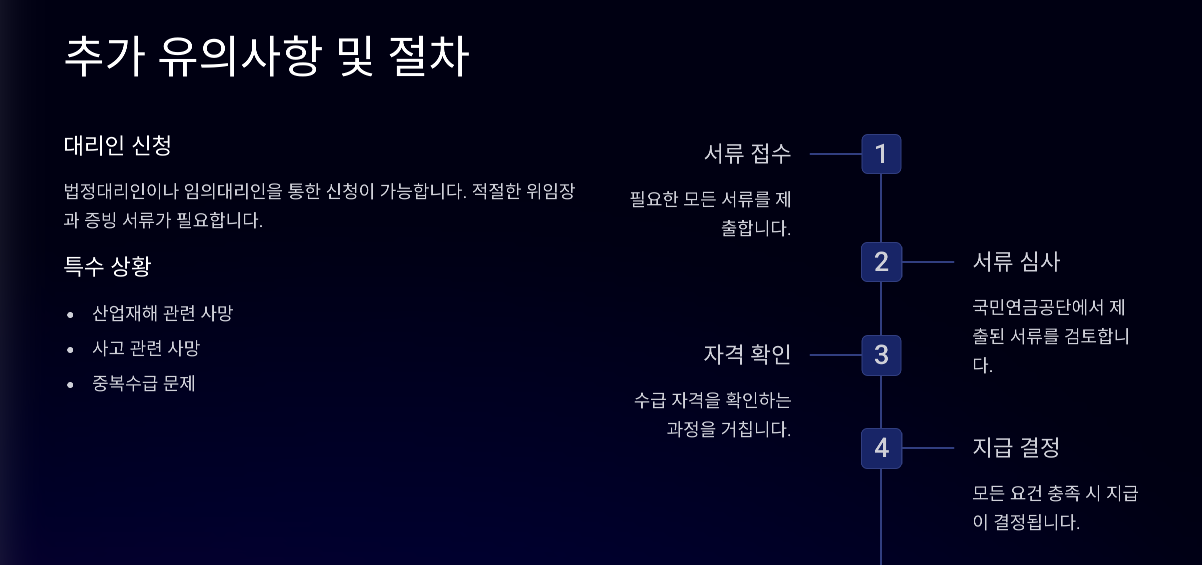 - 공적연금 중복 가입 기간 주의: 2016년 11월 30일 이후 사망자 중 중복 공적연금 가입 기간 포함 시 수급 제한
