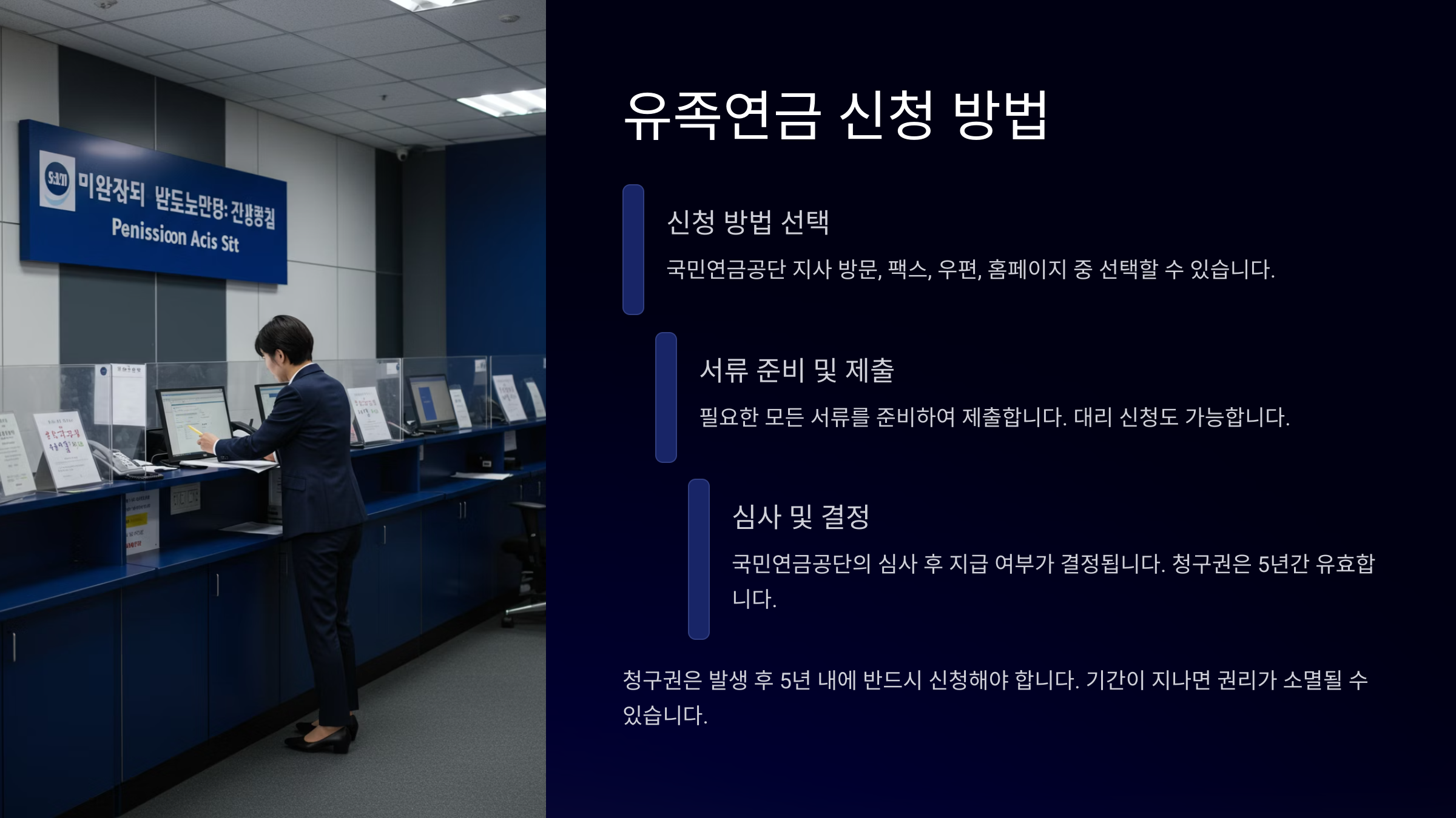 유족연금은 국민연금공단 지사 방문 또는 우편을 통해 신청할 수 있습니다. 신청은 반드시 수급권 발생일로부터 5년 이내에 진행해야 소멸되지 않습니다.