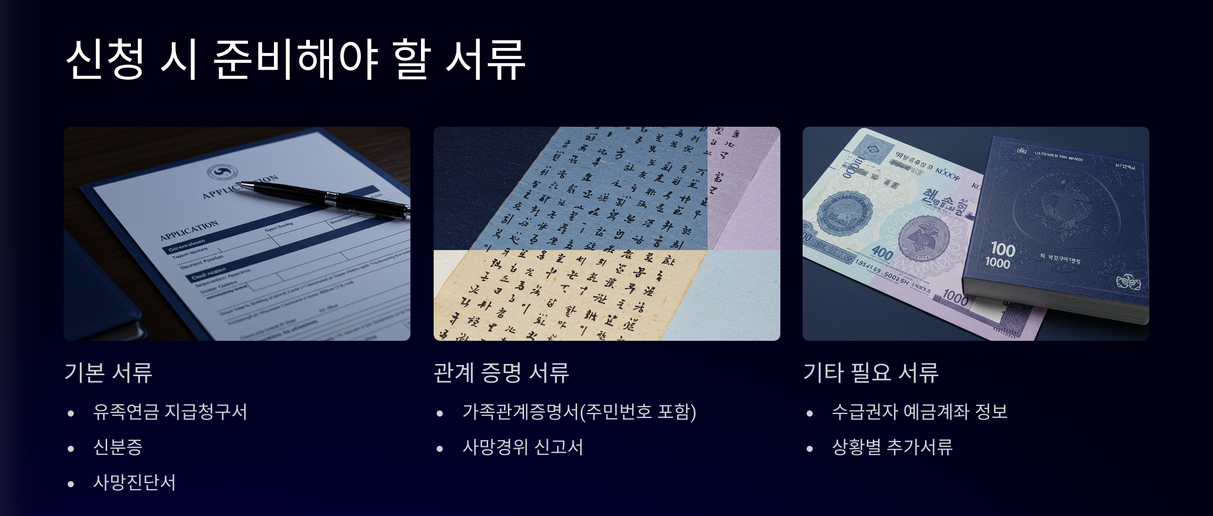 배우자뿐만 아니라 자녀, 부모, 손자녀, 조부모 등 폭넓은 수급 대상이 마련되어 있어 다양한 가족 구성원이 혜택을 받을 수 있습니다. 다만, 이러한 혜택을 받기 위해서는 신청 요건과 절차를 정확히 이해하고 필요한 준비를 철저히 해야 합니다.