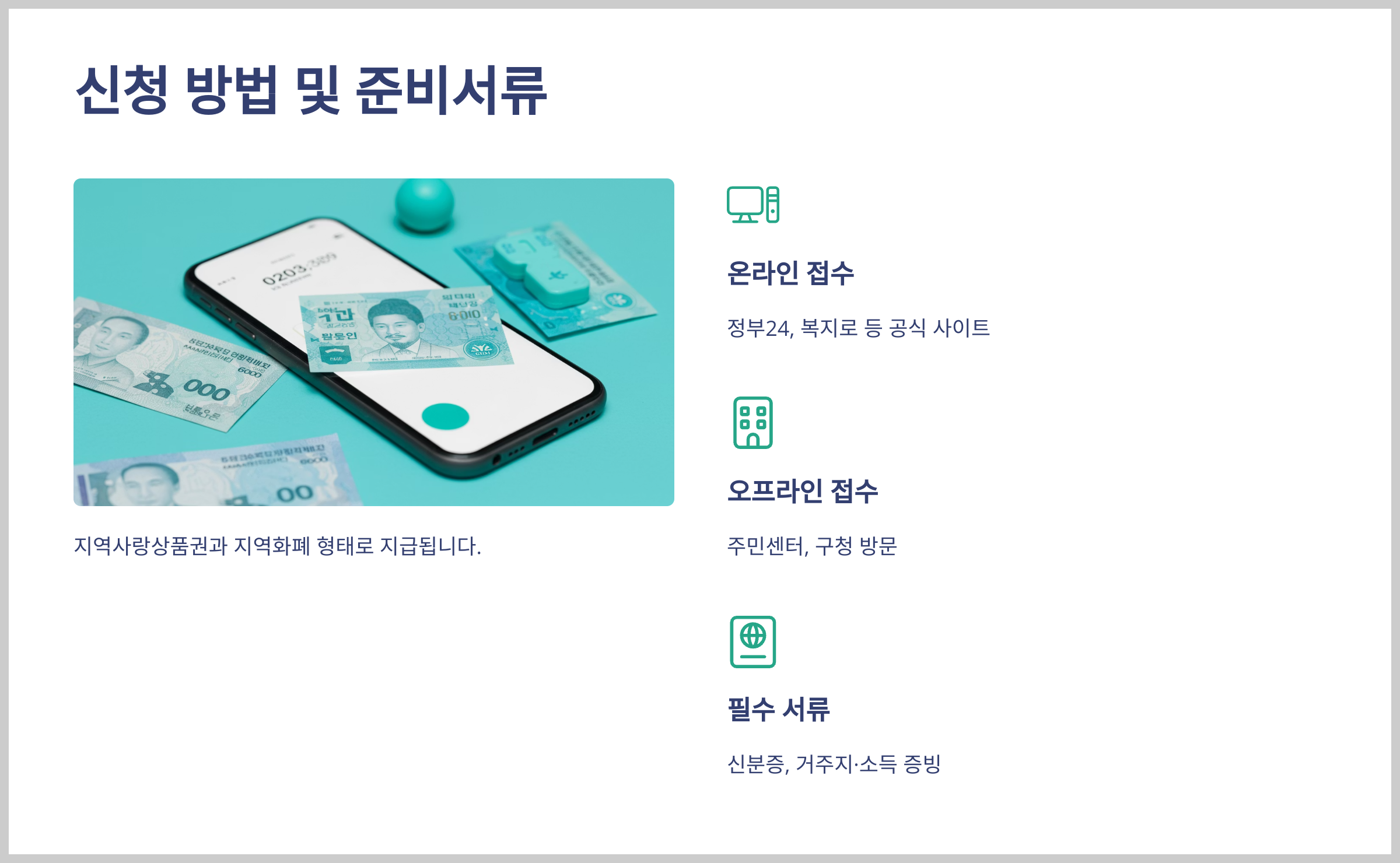 - 지급 수단: 지역사랑상품권, 선불카드, 신용·체크카드 포인트 등