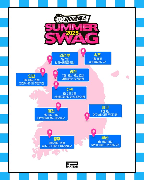 올해도 전국 투어로 돌아온 싸이 흠뻑쇼! 2025년 여름, 6월 말부터 8월 말까지 아래 도시에서 진행됩니다.