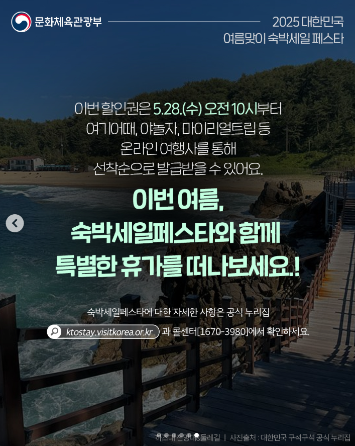 본격적인 여름휴가 시즌, 국내 여행도 알차게 떠날 수 있는 절호의 기회가 찾아왔습니다. 2025 대한민국 숙박세일페스타는 문화체육관광부와 한국관광공사가 주최하는 대규모 여행 장려 행사로, 전국 숙소를 최대 5만 원 할인된 가격으로 예약할 수 있는 프로모션입니다.