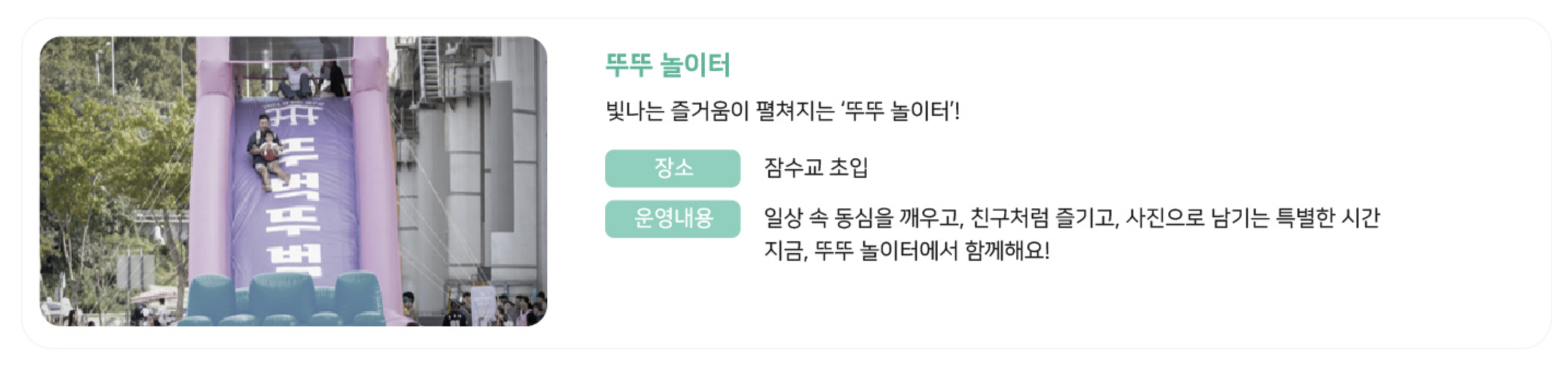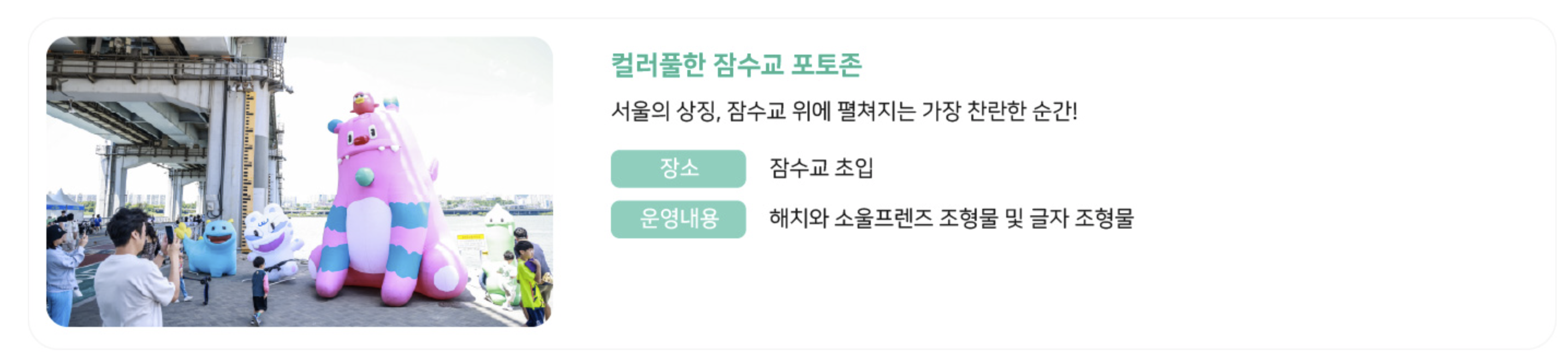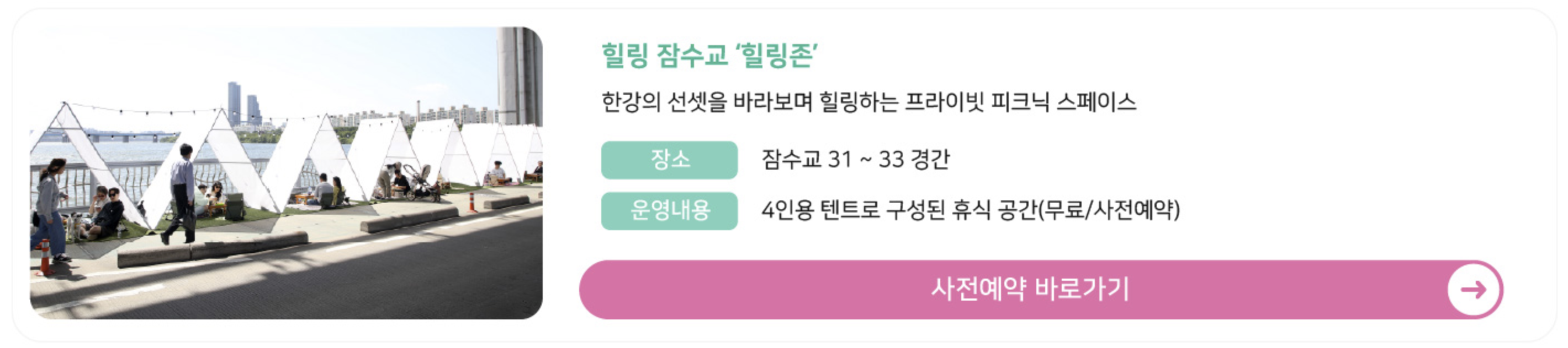 잠수교 뚜벅뚜벅 축제의 핵심 공간, 바로 이 두 곳입니다. 이 두 공간 모두 사전예약 우선이며, 특히 힐링존은 빠른 마감이 많으니 서둘러 예약하시길 추천드립니다!