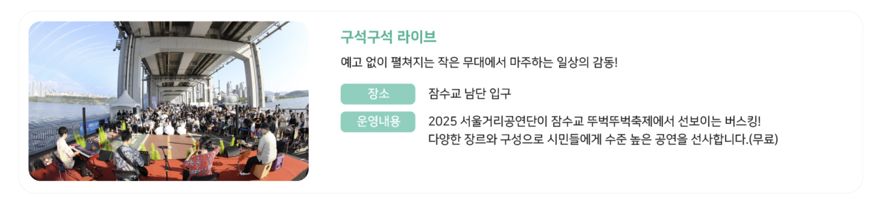 하루쯤은 복잡한 도심의 소음 대신, 강바람과 음악, 그리고 사람 냄새 나는 거리 위를 걷고 싶지 않으신가요? 잠수교 뚜벅뚜벅 축제는 그저 보는 축제가 아니라, 직접 걷고, 쉬고, 즐기고, 기록하는 서울 속 가장 느긋한 하루를 선물해줍니다.