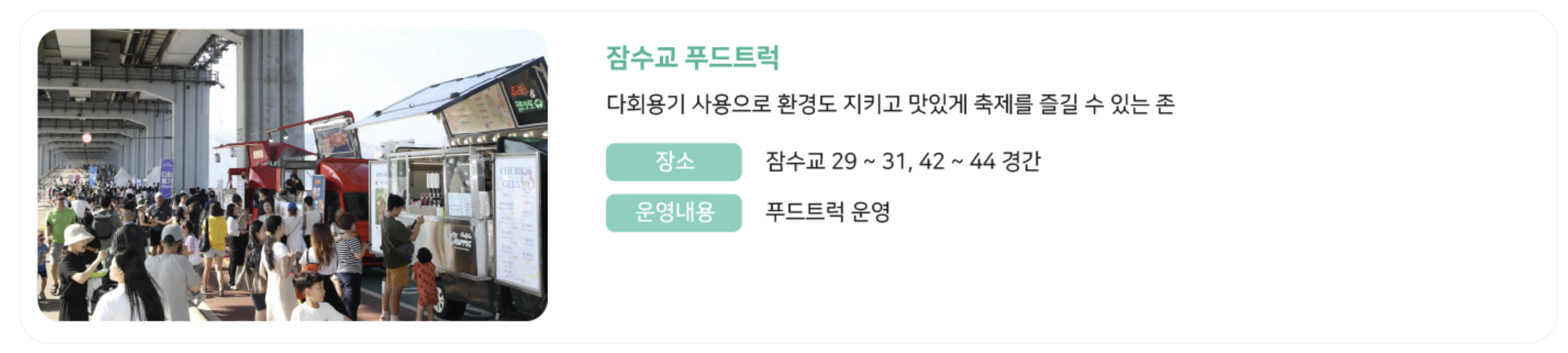 잠수교 위에는 푸드트럭부터 피크닉존, DJ파티존까지 다양한 테마 공간이 설치되어 누구나 자유롭게 이용할 수 있습니다. 하지만 인기 체험존은 사전예약 필수 (현장 신청은 잔여분 한정)이기 때문에 미리 예약하시는것을 추천드립니다.