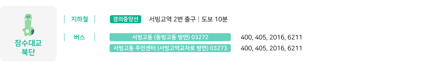 | 북단 | 서빙고역 2번 출구 | 약 10분 | 한적하고 여유로운 분위기 |