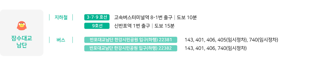 - 3호선 고속터미널역 또는 9호선 신반포역에서 도보 약 10분 거리!