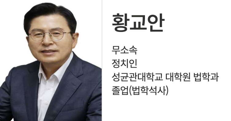| 7 | 황교안 | 무소속 | 前 국무총리 / 前 법무부 장관 | 질서, 안보우선 |