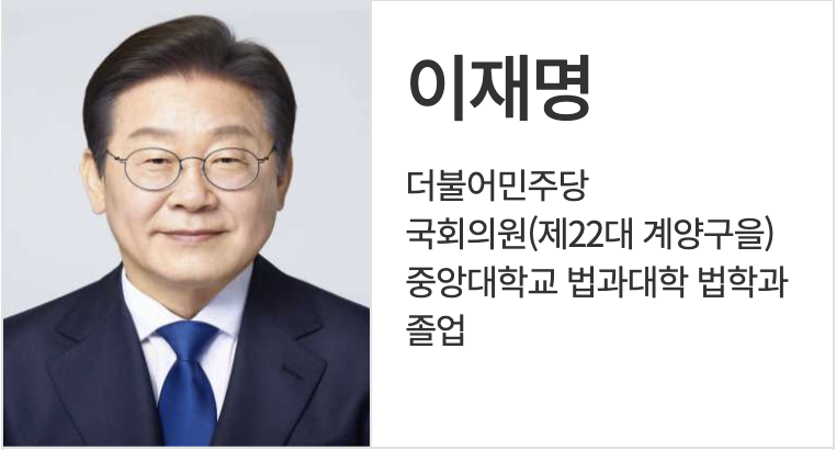 - 경력: 성남시장, 경기도지사, 더불어민주당 대표