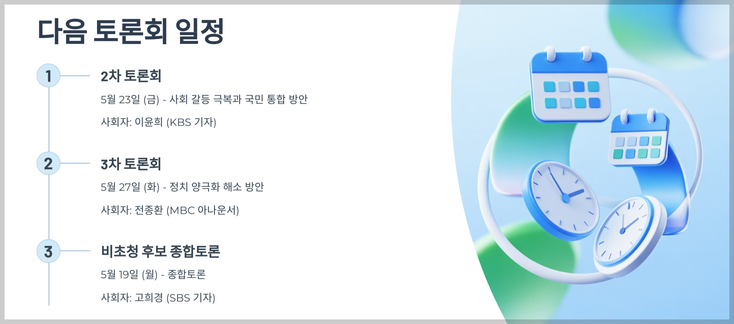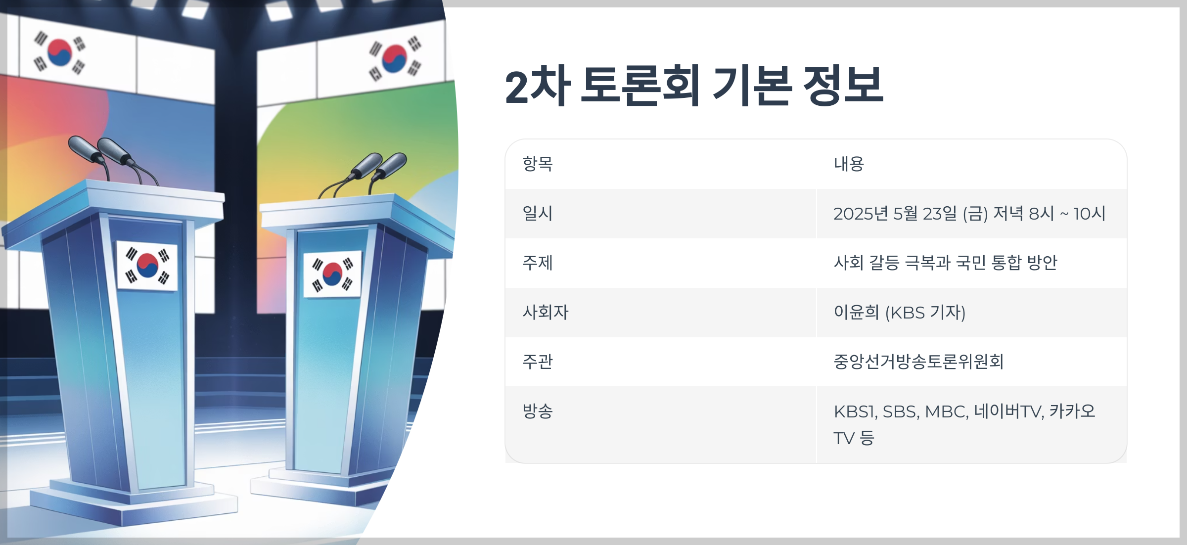 2025년 5월 23일 금요일 저녁 8시, 두 번째 대통령 후보자 토론이 생중계로 열립니다. 이번에는 ‘사회 갈등 극복과 통합’이라는 주제로 후보자들이 보다 민감하고 현실적인 질문에 답할 예정입니다. 이 글에서는 생중계 보는 법, 토론 주제 및 관전 포인트까지 빠르게 정리해드리겠습니다.