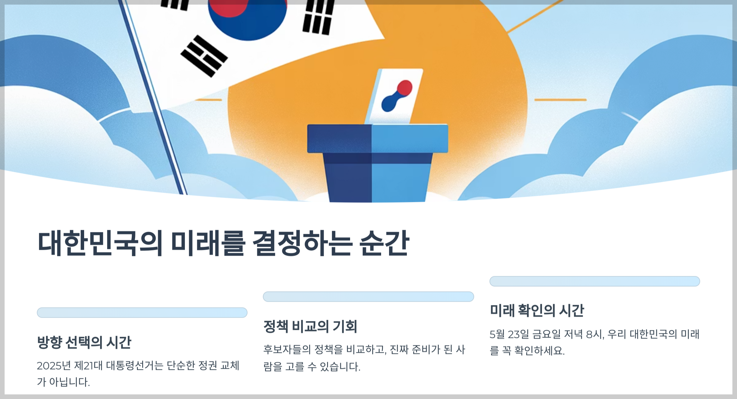 2025년 제21대 대통령선거는 단순한 정권 교체가 아닙니다. 대한민국의 미래가 걸린 방향 선택의 시간입니다. 이번 2차 토론회는 후보자들의 정책을 비교하고, 국민을 위한 진짜 준비가 된 사람을 고를 수 있는 기회입니다.