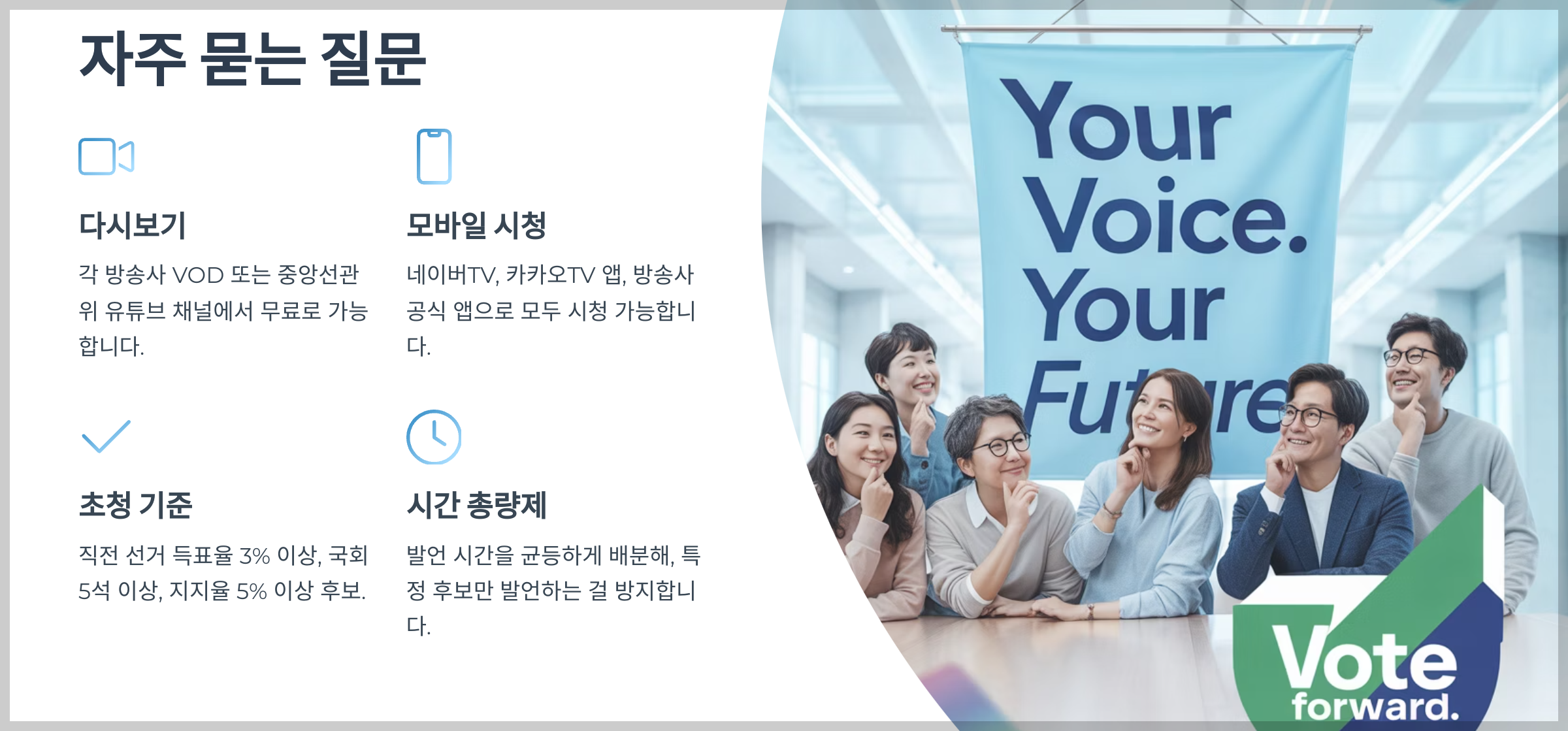 A. 각 방송사 VOD 또는 중앙선관위 유튜브 채널에서 무료 다시보기 가능합니다.