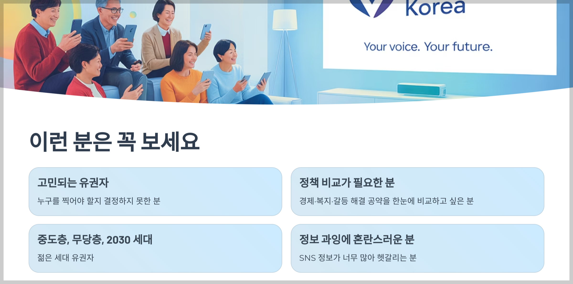 - 후보자들의 경제·복지·갈등 해결 공약을 한눈에 비교하고 싶은 분