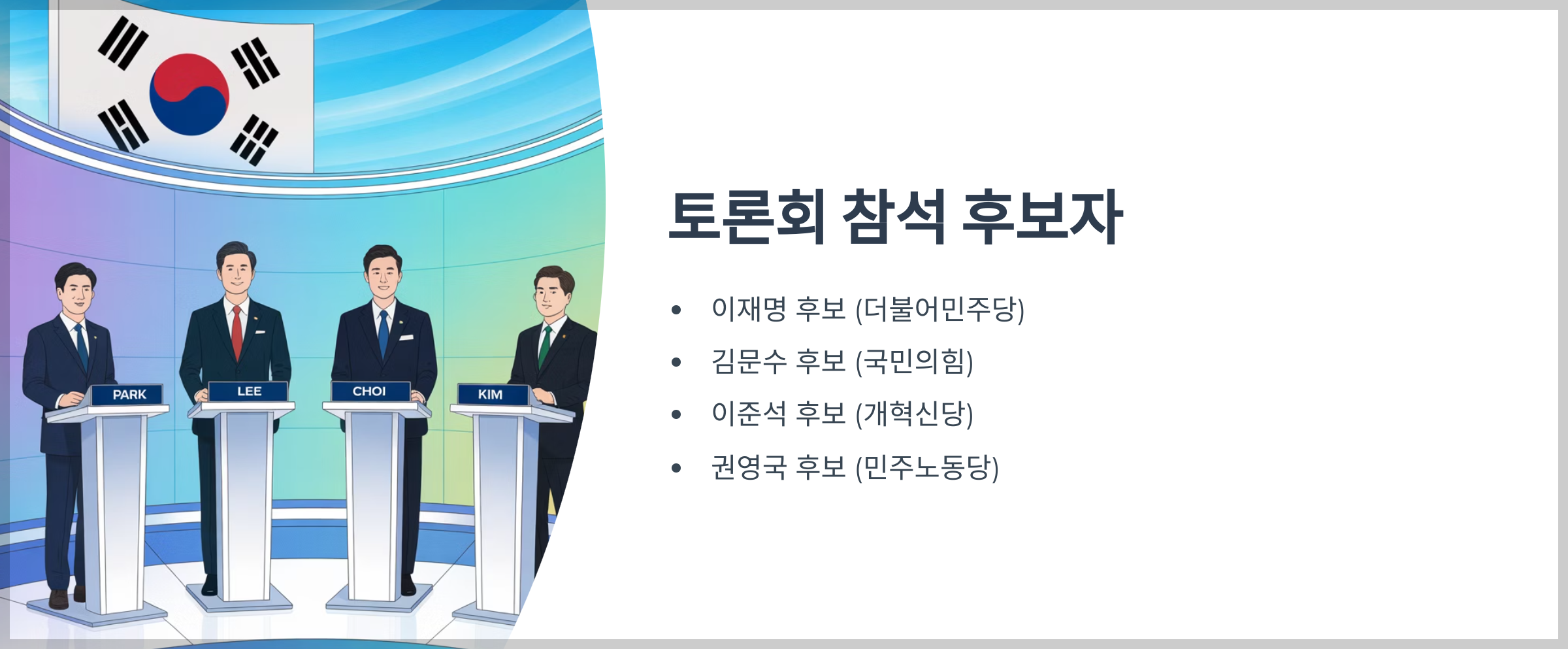 지난 1차 TV토론회(5월 18일)에서는 “구체성 없는 비전 제시에 그쳤다”는 비판과 함께, “후보 간 뚜렷한 차이를 처음으로 보여준 자리였다”는 평가도 있었습니다. 특히 이재명, 김문수 간의 경제 정책 대립, 그리고 이준석 후보의 중도 표심 전략이 주목받았습니다.