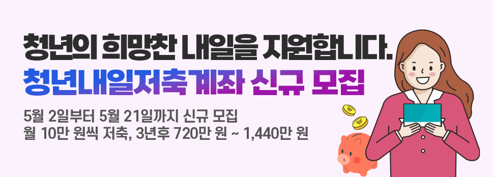 3년간 360만 원 저축하면 정부가 최대 1,080만 원을 더 얹어주는 셈! 청년 스스로 돈을 모으는 습관도 기르고 정부가 확실한 금전적 지원도 해주는 ‘저축형 복지정책’의 대표적인 성공 사례로 꼽히는 청년내일 저축계좌, 지금 바로 신청하세요!