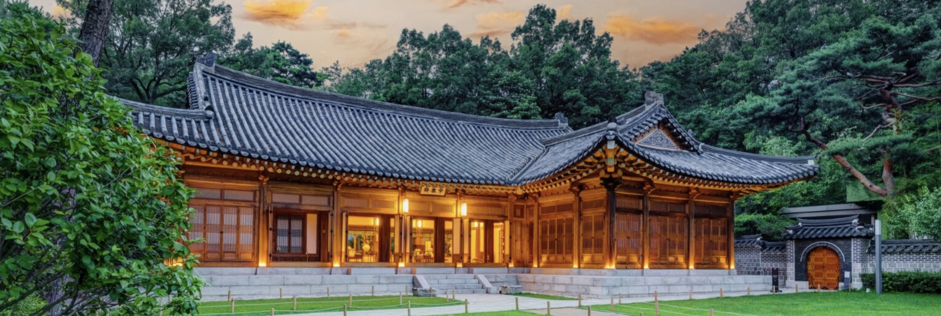 기와와 단청의 디테일이 조명 아래 더욱 빛나며, 한국 건축미의 정수를 보여줍니다.