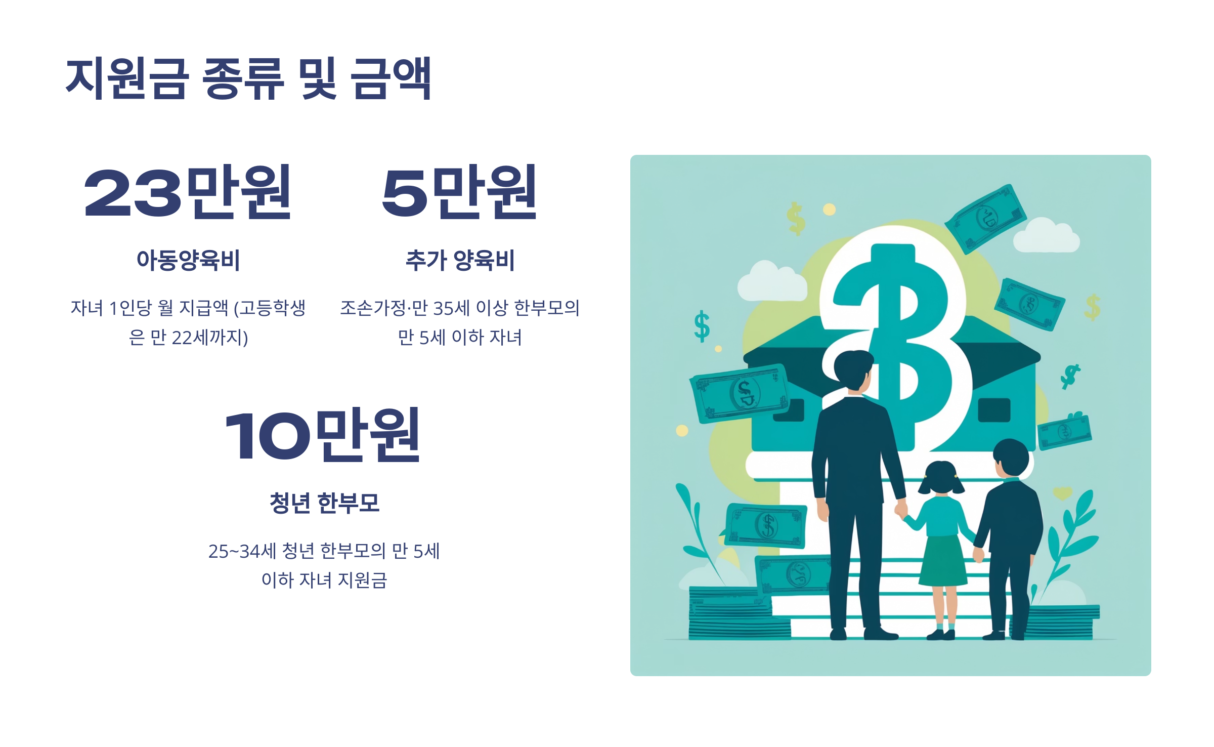 - 아동양육비 월 최대 23만 원 + 추가 지원금