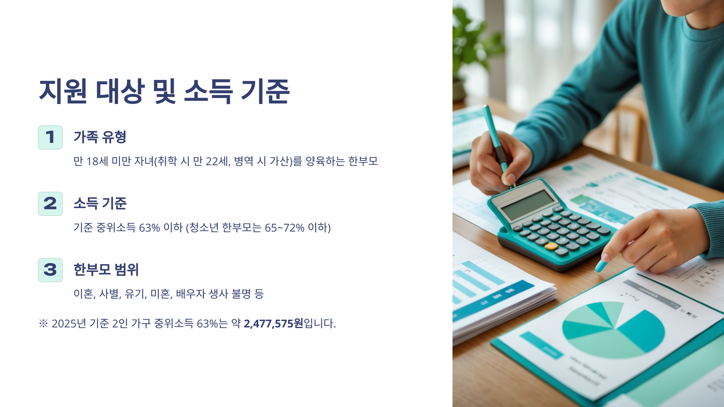 | 소득 기준 | 기준 중위소득 63% 이하 (청소년 한부모는 65~72% 이하) |