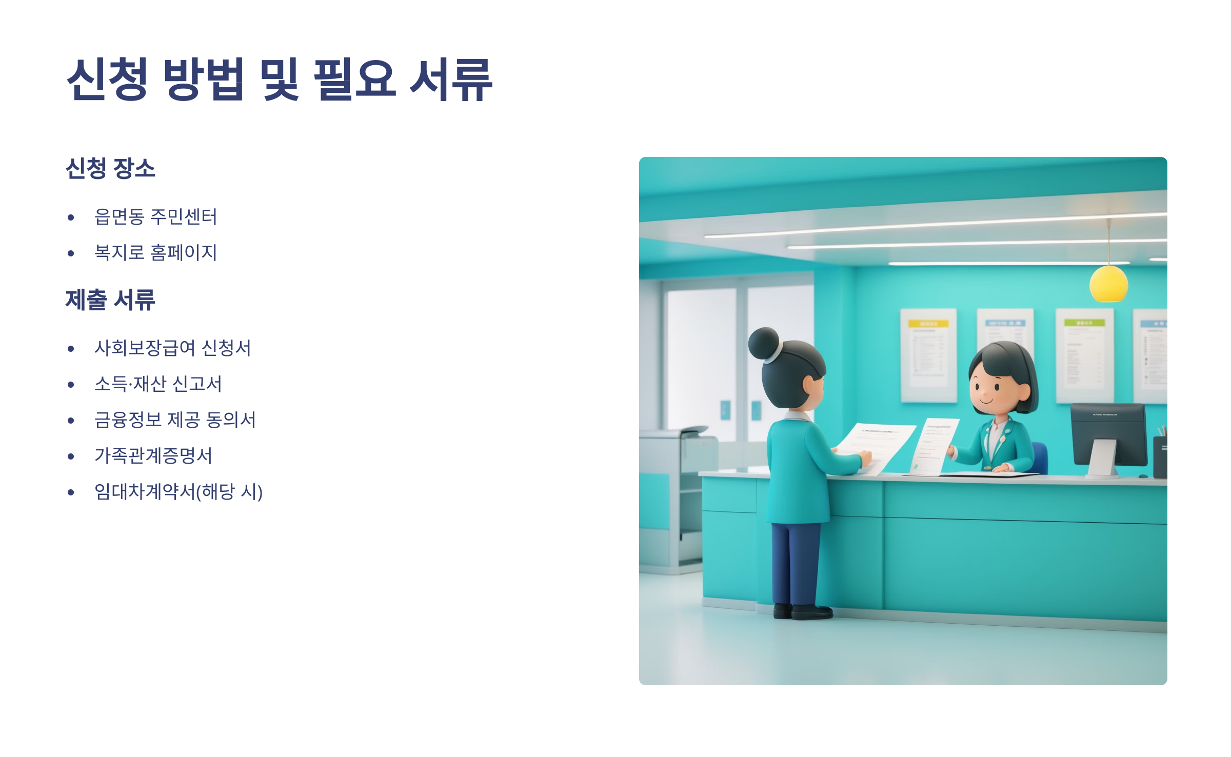 거주지 주민센터 또는 복지로 사이트를 통해 신청이 가능하며, 제출 서류는 아래와 같습니다.