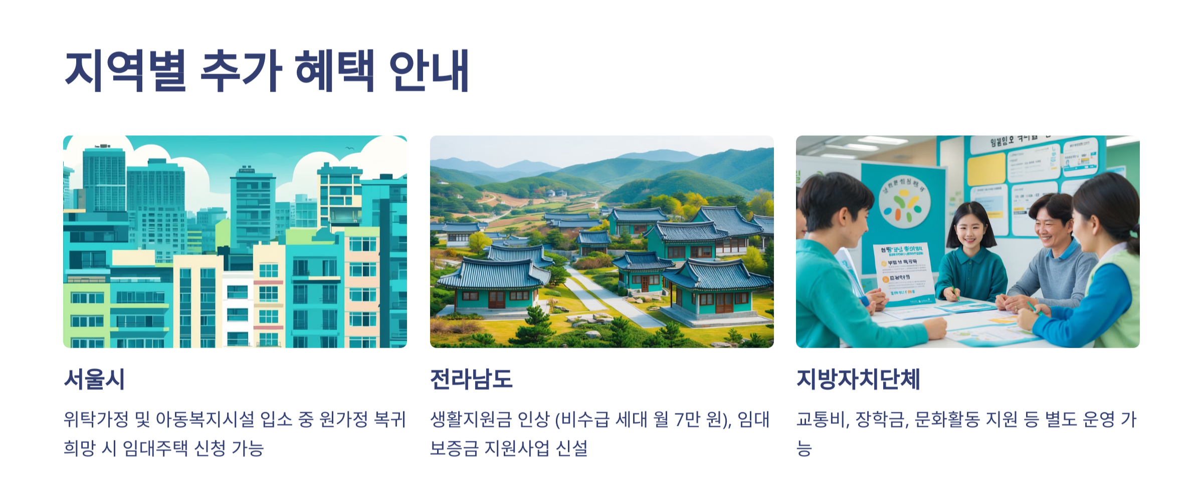 - 전라남도: 생활지원금 인상 (비수급 세대 월 7만 원), 임대보증금 지원사업 신설